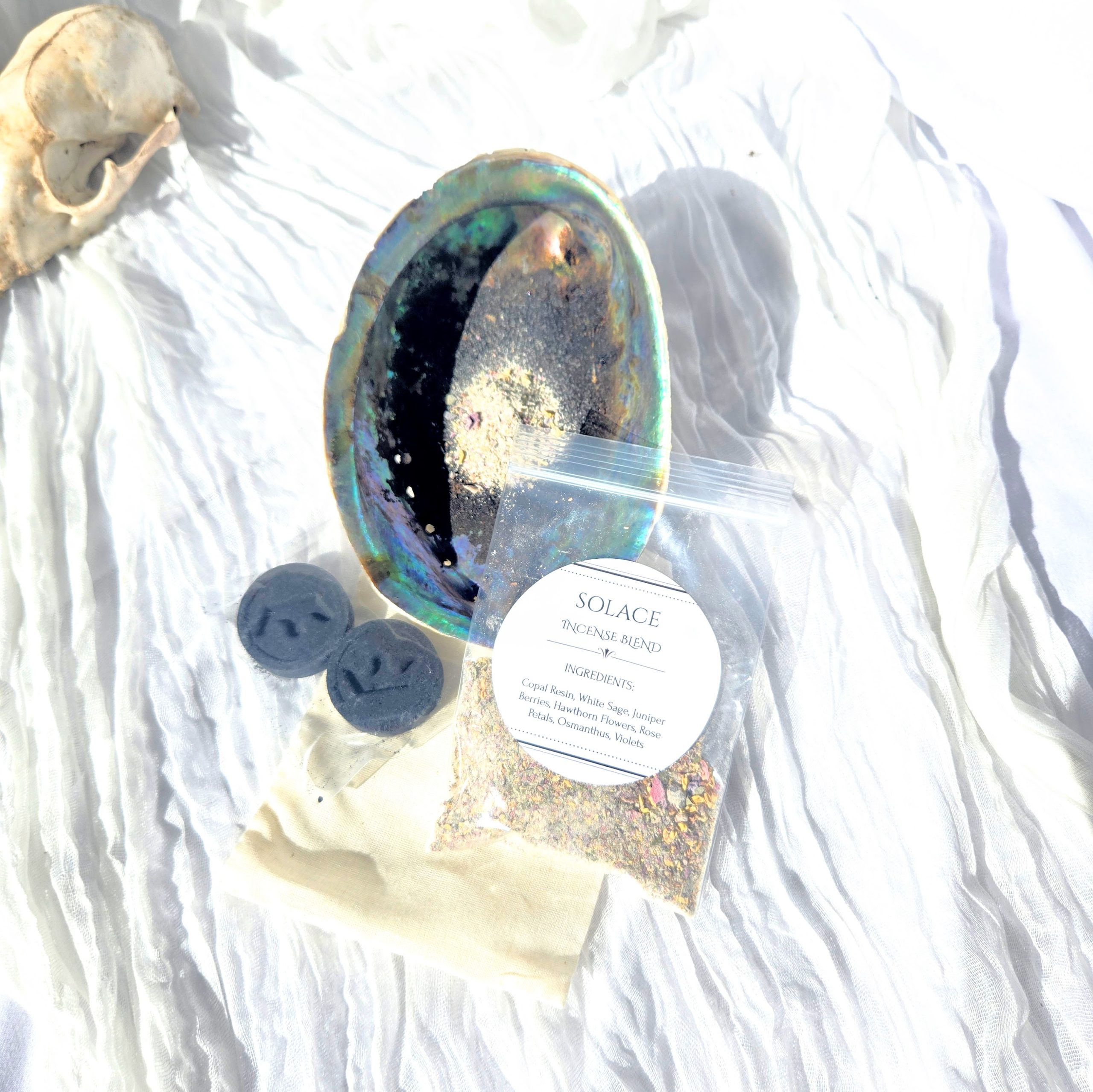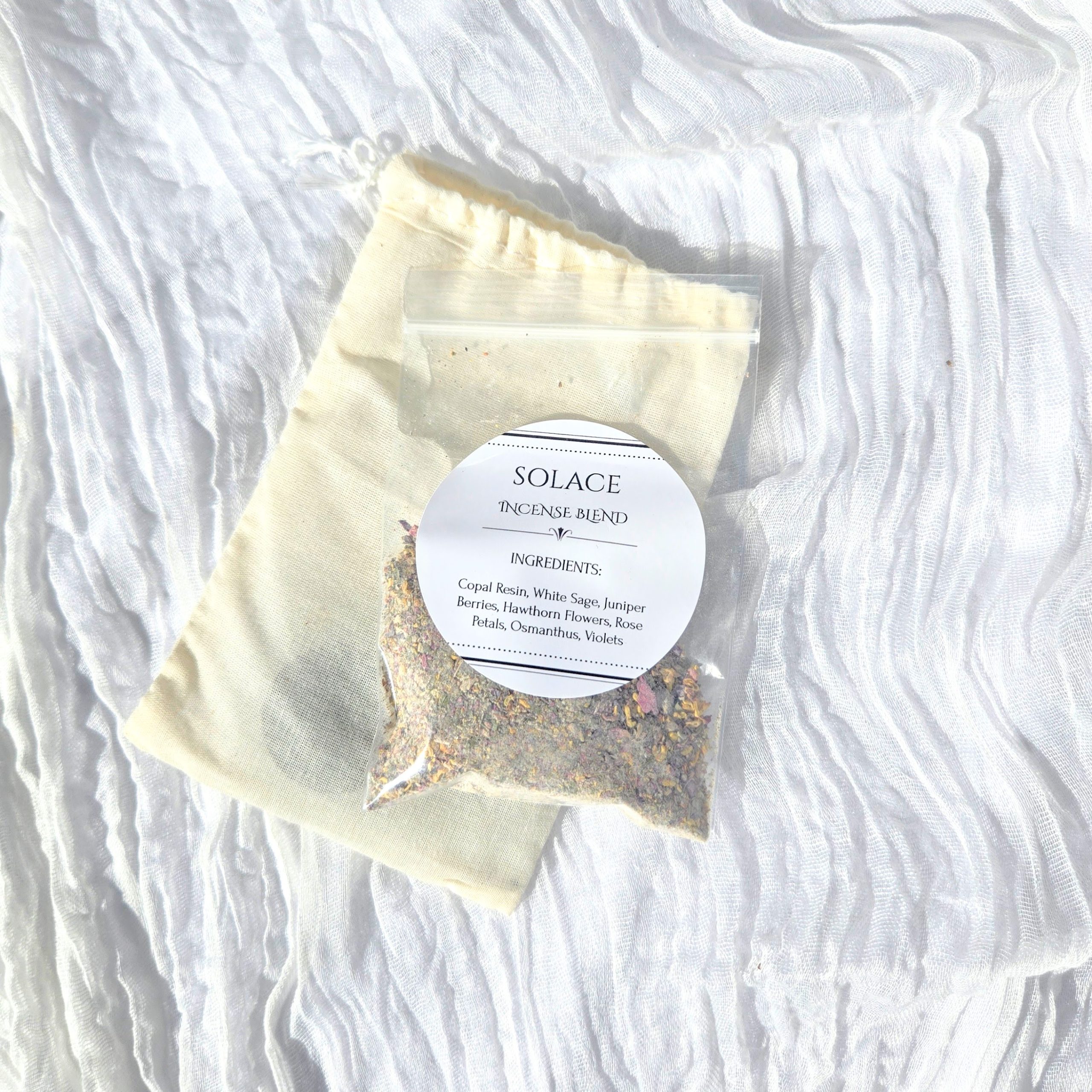 Solace is a loose incense blend designed to dissolve anxiety and usher in profound tranquility. It is crafted with a delicate bouquet of peaceful botanicals. This sacred blend creates an atmosphere of deep calm, guiding your mind back to balance and quietude.